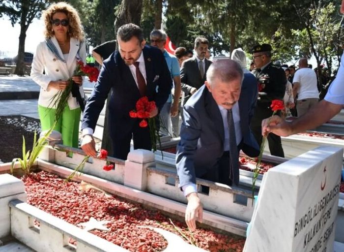 Keşan Kaymakamı Aziz Mercan, saat 10.00’da protokol üyeleri ile birlikte Asri Mezarlık’taki şehit kabirlerini ziyaret etti. Şehit ailelerine başsağlığı dileyen Mercan ve protokol üyeleri, şehit mezarlarına çiçek bıraktı.