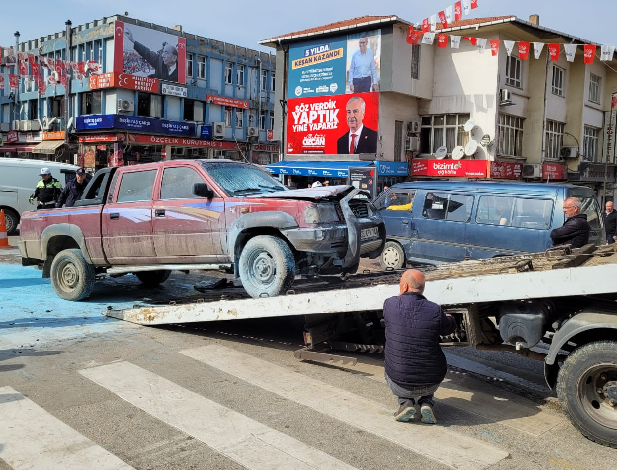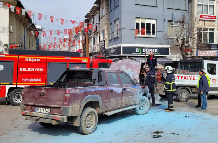 Saat 12.15 sıralarında, Önder Caddesi’nden gelerek Alparslan Türkeş Meydanı’na giren İ.E. yönetimindeki 35 ATR 240 plakalı kamyonetin motor kısmından dumanlar çıkmaya başladı. İ.E., aracını Atatürk Anıtı önünde durdurarak çevreden yardım istedi. Bu sırada çarşı merkezinde bulunan Keşan Belediyesi İtfaiye Amiri Faruk Gezer’e durumun bildirilmesi üzerine, Gezer, olay yerine gelerek çevre işyerlerinde topladığı yangın söndürme tüpleriyle araç yangınını söndürdü. Ardından gelen itfaiye ekipleri de araçta soğutma çalışmasında bulundu.