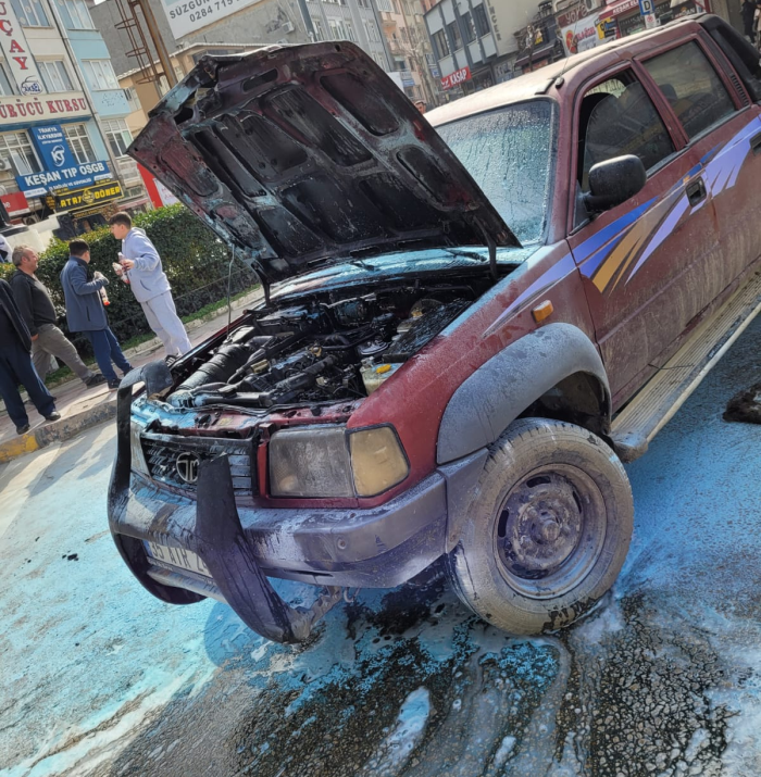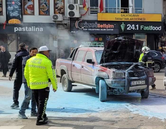 Çarşı ortasında alev alan kamyonete, itfaiye amirinden hızlı müdahale