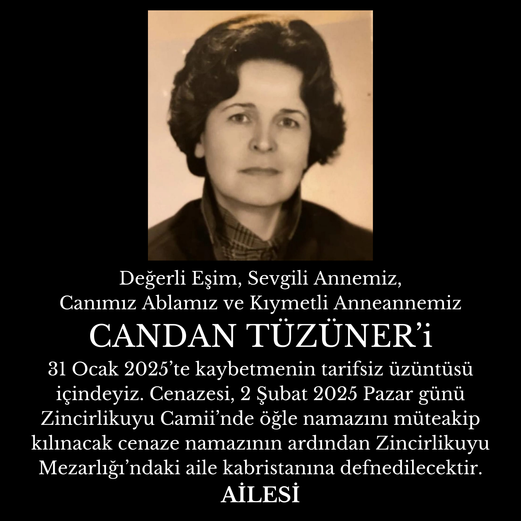 Avukat Mehmet Ali Tüzüner'in eşi, Eczacı Handan ve Nuri Peşkircioğlu, Özlem ve Bora Özkonuksever, Pelin ve Levent Yaşar’ın anneleri olan Avukat Candan Tüzüner’in cenazesi, 2 Şubat 2025 Pazar günü öğle vakti Zincirlikuyu Camii’nde kılınacak cenaze namazını takiben Zincirlikuyu aile kabristanına defnedilecek.