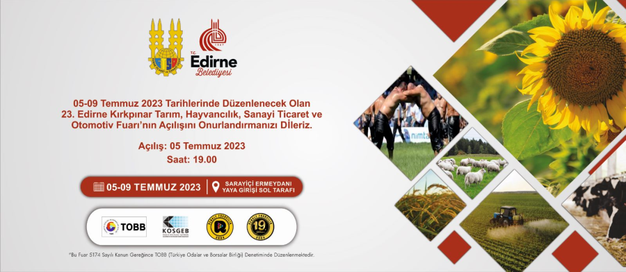 23. Edirne Kırkpınar Tarım Hayvancılık Sanayi Ticaret ve Otomotiv Fuarı, 5 Temmuz 2023 Çarşamba günü saat 19.00'da törenle açılacak.
