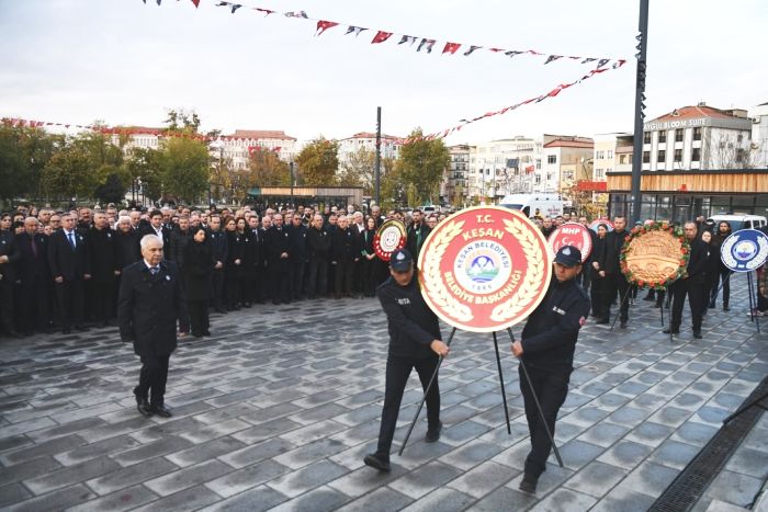 10 Kasım 2024 Pazar günü saat 08.50’de Cumhuriyet Meydanı’nda başlayan ilk törende, Atatürk Anıtı’na çelenkler sunuldu. Buradaki törene; Keşan Kaymakamı Cemalettin Yılmaz, Keşan Garnizon Komutanı Tuğgeneral Gürcan Sezengöz, Keşan Belediye Başkanı Op. Dr. Mehmet Özcan, Keşan Cumhuriyet Başsavcısı Hilal Bozdağ, kurum amirleri, siyasi parti ve sivil toplum kuruluşlarının temsilcileri, gaziler, askeri ve sivil erkan ile vatandaşlar katıldı.