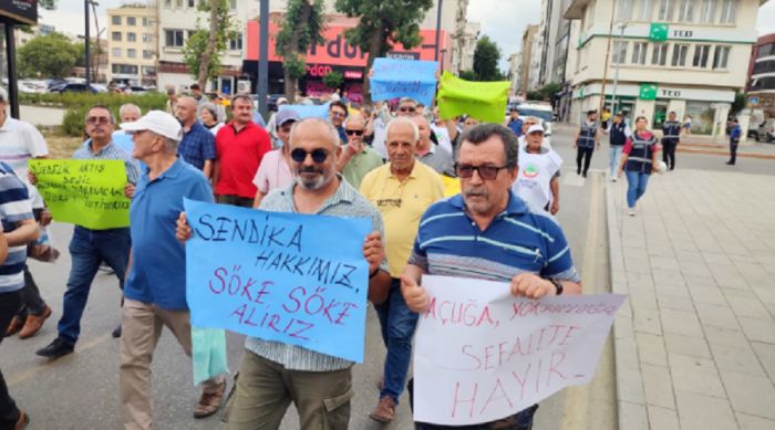 Keşan Kent Müzesi önünde toplanan sendika yöneticileri ve emekliler, ellerindeki dövizlerle birlikte slogan atarak Cumhuriyet Meydanı’na yürüdü.