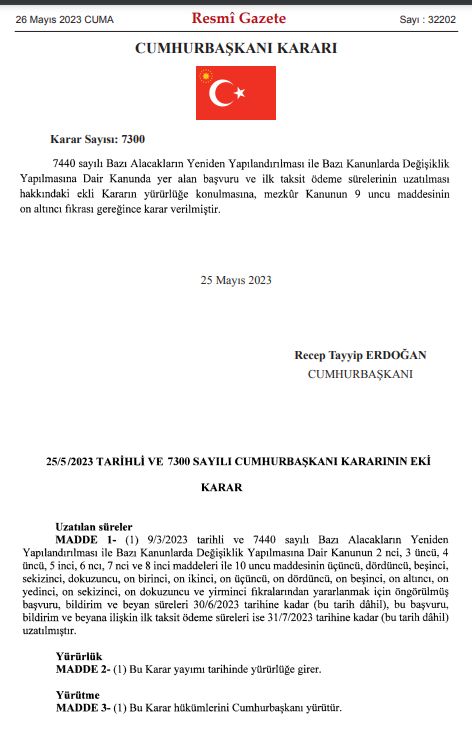 9 Mart 2023 tarih ve 7440 sayılı Bazı Alacakların Yeniden Yapılandırılması ile Bazı Kanunlarda Değişiklik Yapılmasına Dair Kanundan yararlanmak için öngörülmüş olan başvuru, bildirim ve beyan süreleri, 30 Haziran 2023 tarihine kadar; bu başvuru, bildirim ve beyana ilişkin ilk taksit ödeme süreleri ise 31 Temmuz 2023 tarihine kadar uzatıldı.