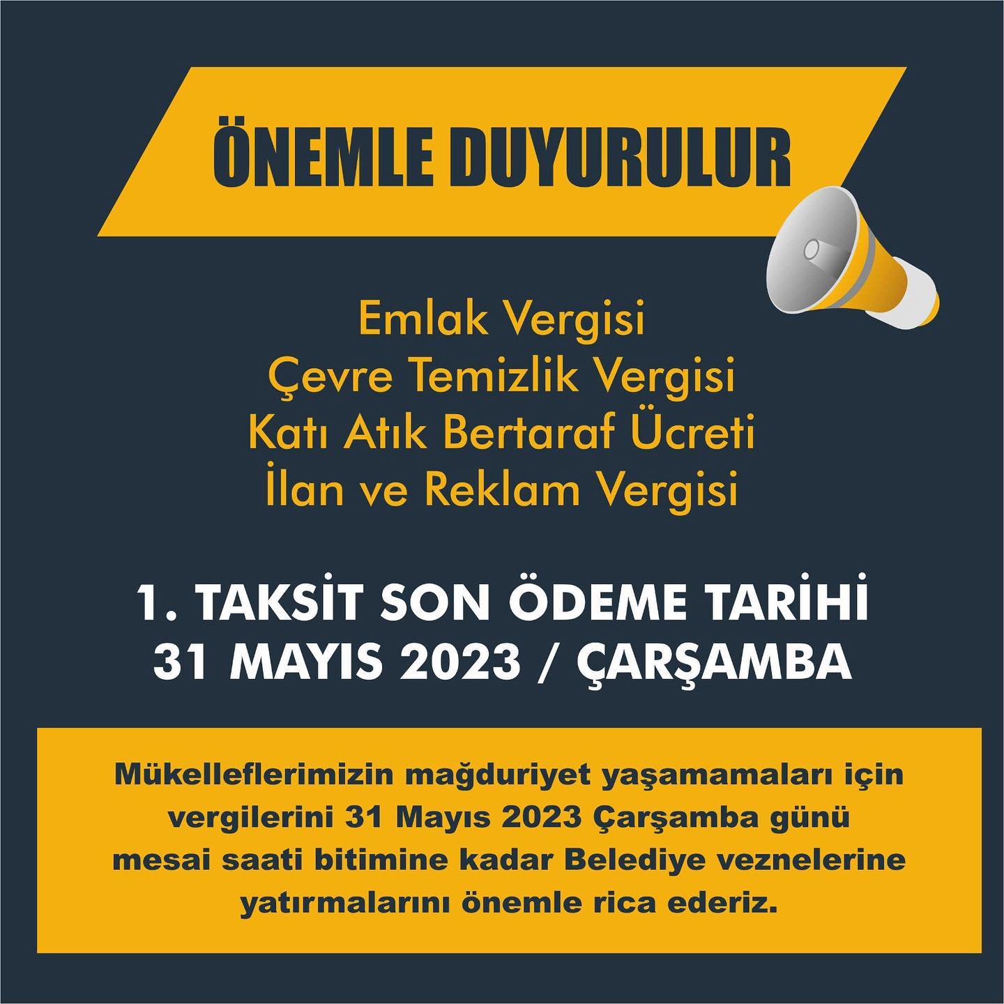 Keşan Belediyesi; emlak, cevre temizlik ve ilan ve reklam vergileri ile katı atık bertaraf ücreti 1.taksit ödeme süresinin 31 Mayıs’ta sona ereceğini bildirdi.