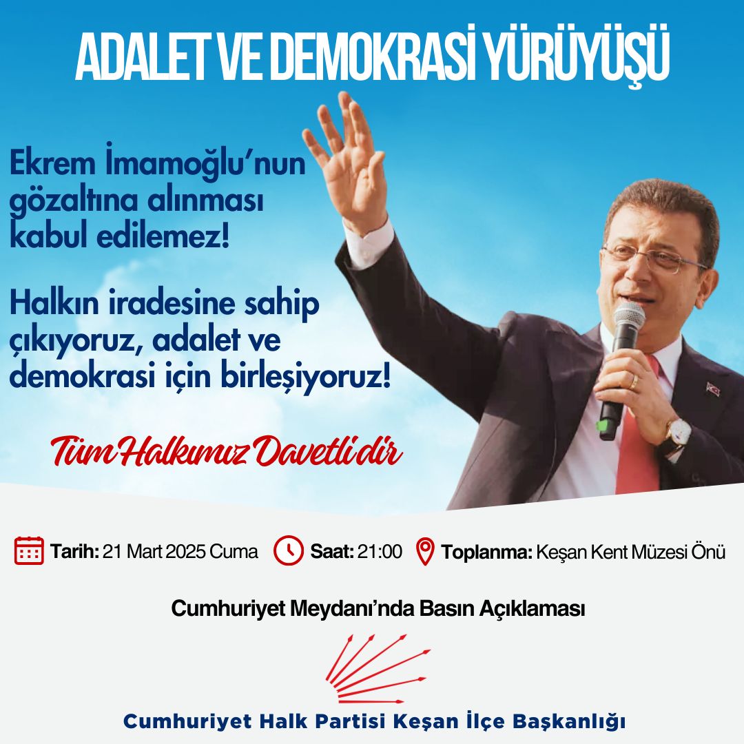 CHP Keşan İlçe Başkanlığı’ndan yapılan açıklamada, “Cumhuriyet Halk Partisi Keşan İlçe Başkanlığı ile Emek ve Demokrasi Platformu olarak, halkın iradesine ve demokrasiye sahip çıkmak için Adalet ve Demokrasi Yürüyüşü düzenliyoruz! Bu ülkenin vicdanı susturulamaz! Hukukun üstünlüğü, adalet ve özgürlük için meydanlara çıkıyoruz! Ekrem İmamoğlu’na yönelik haksız ve antidemokratik uygulamalara karşı durmak, halkın iradesini savunmak için birlikte yürüyelim, birlikte haykıralım! Yürüyüşümüzün ardından Cumhuriyet Meydanı’nda büyük bir miting ile sesimizi tüm Türkiye’ye duyuracağız!” denildi.