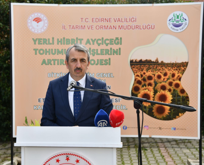 Programda konuşan Edirne Valisi Yunus Sezer, son yıllarda yaşanan kuraklık koşullarının tarımsal üretimi olumsuz etkilediğine işaret etti. Bazı bölgelerde verimin ciddi oranda düştüğünü belirten Sezer, sulama imkânı bulunan alanlarda ise üretimin belirgin şekilde arttığını dile getirdi. Bu durumun, su yönetimi ve doğru tohum seçiminin önemini bir kez daha ortaya koyduğunu ifade etti. Edirne’nin ayçiçeği üretiminde Türkiye’nin önde gelen illerinden biri olduğunu hatırlatan Sezer, yerli ve bölgeye uyumlu tohumların kullanımının yaygınlaştırılmasıyla verimliliğin artırılmasının hedeflendiğini söyledi. Sulama yatırımlarının da hızla sürdüğünü belirten Sezer, özellikle baraj ve sulama projeleriyle üreticinin elinin güçlendirildiğini kaydetti.