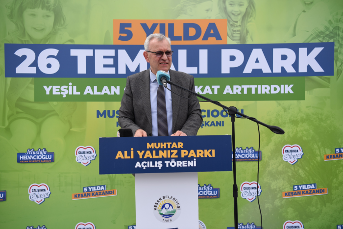 Programda konuşan Helvacıoğlu, “5 yıl gibi kısa bir sürede, hayalet bir şehirden, hayal edilen bir şehre ulaştık. Her şehrin bir ruhu vardır. Keşan’ın da artık bir ruhu var. Bunu başarabilmek için de rutin belediyecilik hizmetlerinin dışına çıkmak gerekiyordu. Sizlerin de enerjisiyle bunu başardığımıza inanıyorum. Buranın eski halini hatırlıyorsunuz. Manzarası hoş değildi. Şimdi entegre bir sosyal alan oldu. Keşan’ımıza ve Keşan’ın ışıl ışıl çocuklarına kazandırıp armağan etmek üzere biraradayız. Keşan’da Türkiye’ye örnek bir model uyguluyoruz. Muhtar Ali Yalnız Parkımız, hem çocuklarımıza hem de onlarla birlikte hayallere dalan ailelerine ve büyüklerimize, armağan olsun. Birarada yaşama kültürünü önemseyip, önemli alanlar kazandırmak için çalışıyoruz.