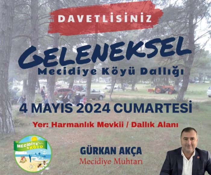 Mecidiye Köyü Muhtarı Gürkan Akça, Harmanlık mevkiindeki dallık alanında yapılacak şenliğe, tüm yöre halkını davet etti.