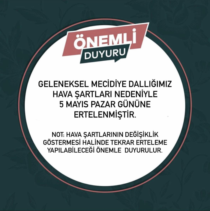 Mecidiye Köyü Muhtarlığı tarafından yapılan açıklamada, 4 Mayıs 2024 Cumartesi günü yapılacağı duyurulan şenliğin, hava muhalefeti nedeniyle 5 Mayıs'a ertelendiği bildirilirken, hava koşullarının elvermemesi halinde yeniden erteleme olabileceği de belirtildi.