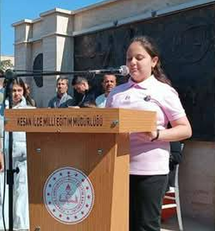 Keşan Kaymakamı Cemalettin Yılmaz, 4. Mekanize Piyade Tugay Komutanı Tuğg. Gürcan Sezengöz, Keşan Belediye Başkanı Op. Dr. Mehmet Özcan, Keşan Cumhuriyet Başsavcısı Hilal Bozdağ, daire amirleri, siyasi partilerin ve STK’ların başkan ve temsilcilerinin de katıldığı törende, öğrenciler adına konuşan Rasim Ergene İlkokulu öğrencisi Eda Derin Akar, “Bağımsızlığımızın ilk adımlarından biri olan bu bayram, hepimize kutlu olsun! 23 Nisan 1920, tüm dünyaya sesimizi duyurduğumuz, tutsaklık zincirlerini kırarak özgürlüğümüzü kazandığımız gündür. Bu bayram bizim bayramımız, sevinçle kutlayalım arkadaşlar! Atatürk gibi büyük bir liderin çocukları olduğumuz için gururlanalım! O’nun ideallerini bir ışık gibi kabul edip, elden ele, gönülden gönüle, kuşaktan kuşağa taşıyalım.” diye konuştu.